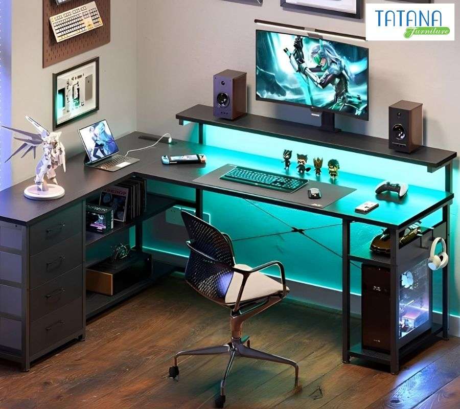 Phù hợp cho góc phòng, bàn chữ L tối ưu hóa không gian với hai mặt bàn riêng biệt – một bên gaming, bên kia làm việc.