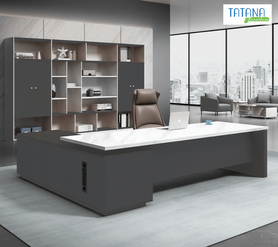 - Bàn Giám Đốc Tatana BGD001: Mặt bàn trắng kết hợp thân đen là sự phối hợp kinh điển trong thiết kế nội thất hiện đại. Kiểu dáng vuông vức, bề mặt rộng, phù hợp nhiều phong cách văn phòng khác nhau. Mẫu này được đánh giá cao nhờ sự cân bằng giữa công năng và thẩm mỹ.