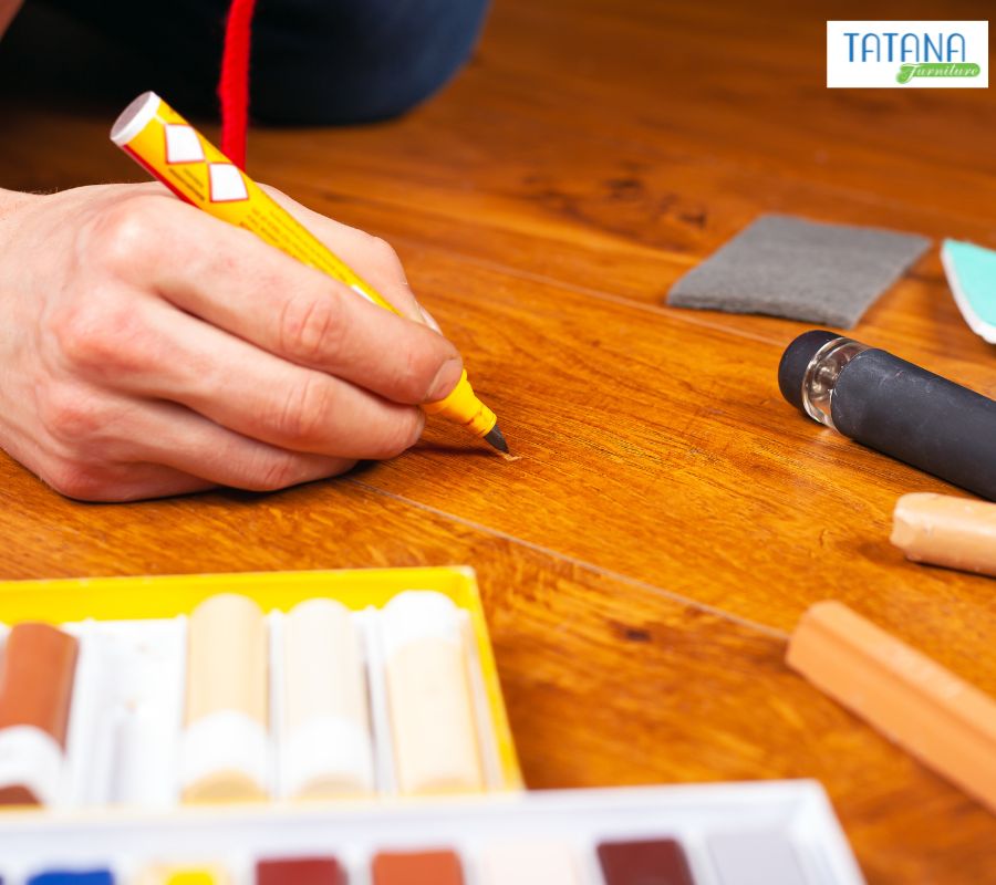 - Dùng sáp gỗ hoặc bút che khuyết điểm chuyên dụng để làm mờ vết xước trên bề mặt.