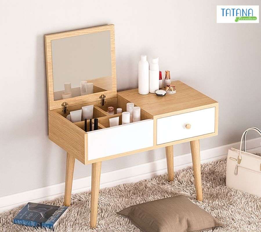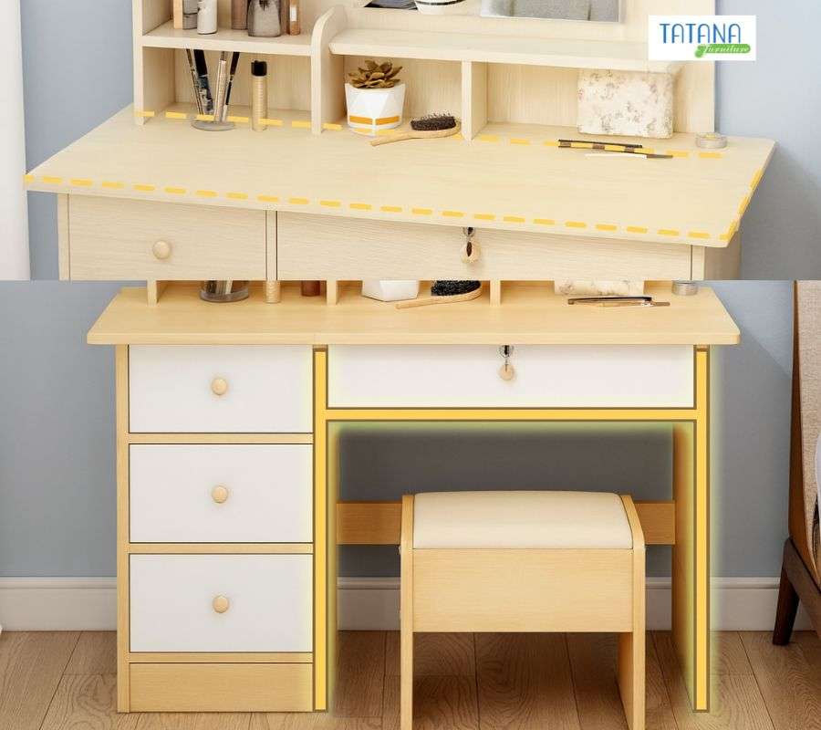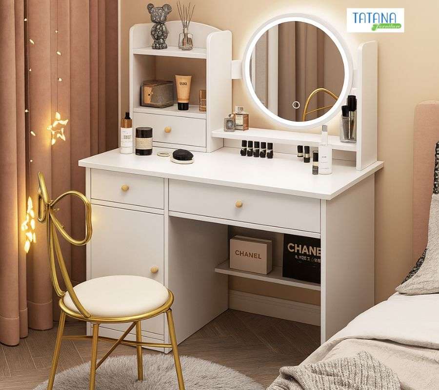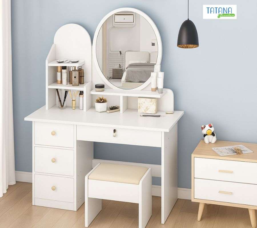 Mẫu bàn trang điểm BTD015 Tatana thiết kế từ MDF chất lượng cao - Nhựa cao cấp: Nhẹ, dễ di chuyển, giá rẻ, màu sắc phong phú. Tuy nhiên độ bền kém hơn gỗ, dễ trầy xước. Phù hợp với phòng trọ, sinh viên, hoặc nhu cầu ngắn hạn.