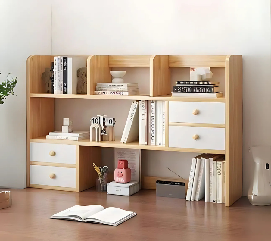 • Kệ sách gỗ mini kết hợp: Một số mẫu kết hợp kệ sách với hộc kéo nhỏ, hoặc các ngăn có kích thước khác nhau, tăng tính đa năng.