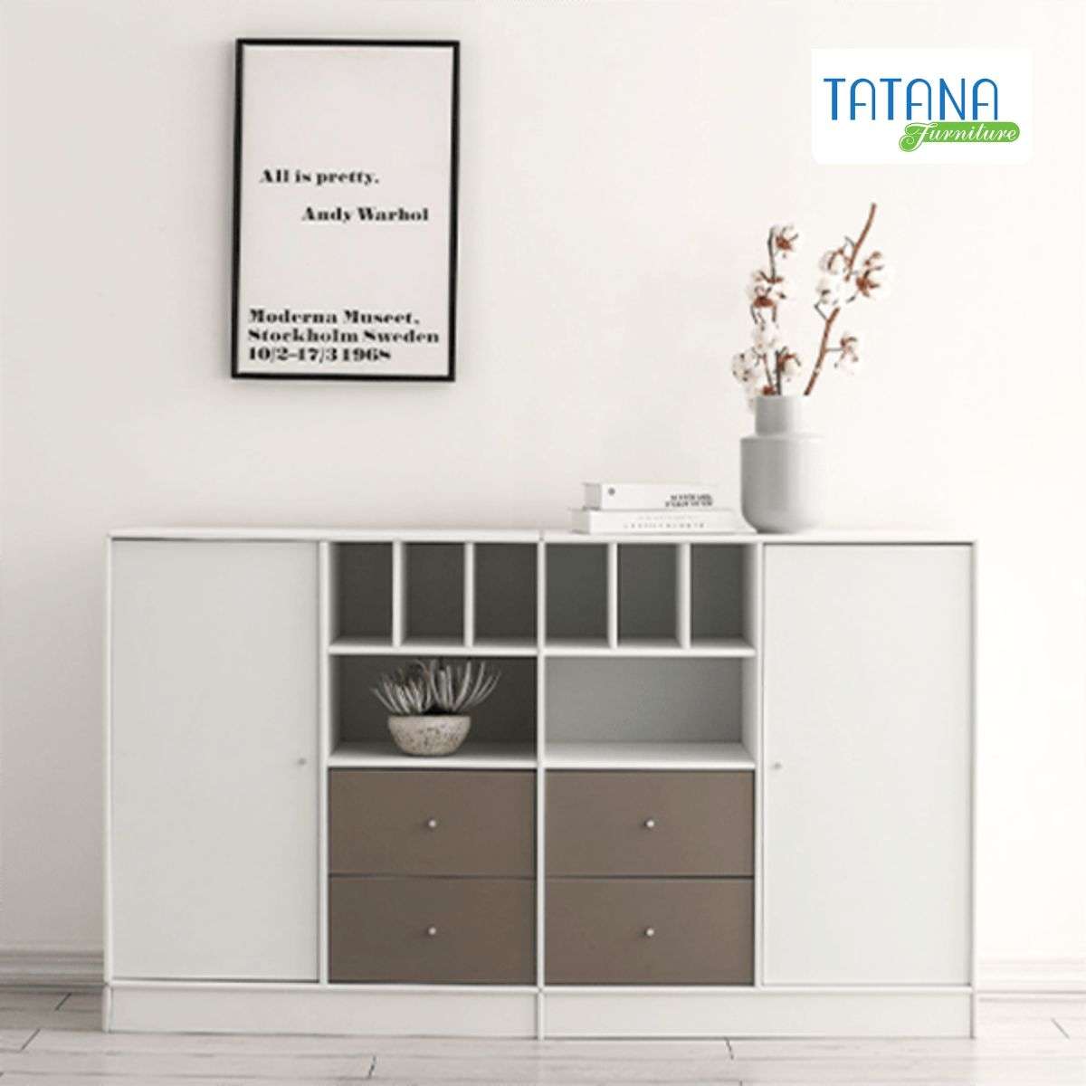 Mẫu TUB17 là một hệ tủ ngang đối xứng. Hai bên là cánh tủ trắng lớn, chính giữa là các ô kệ nhỏ vuông vức để trang trí và 4 ngăn kéo màu xám nhạt bên dưới. Đây là mẫu thiết kế dành riêng cho những ai yêu thích sự ngăn nắp tuyệt đối.