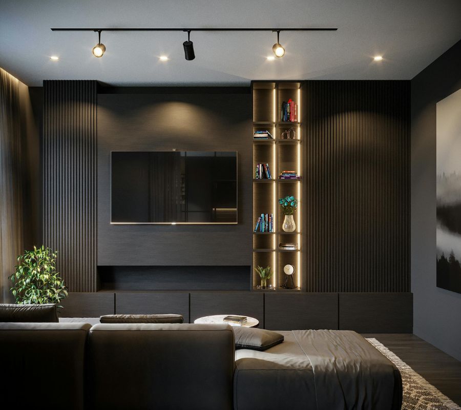 - Lắp đặt đèn LED âm trần hoặc đèn LED dây phía sau kệ tivi để tạo hiệu ứng ánh sáng hắt tường đẹp mắt.