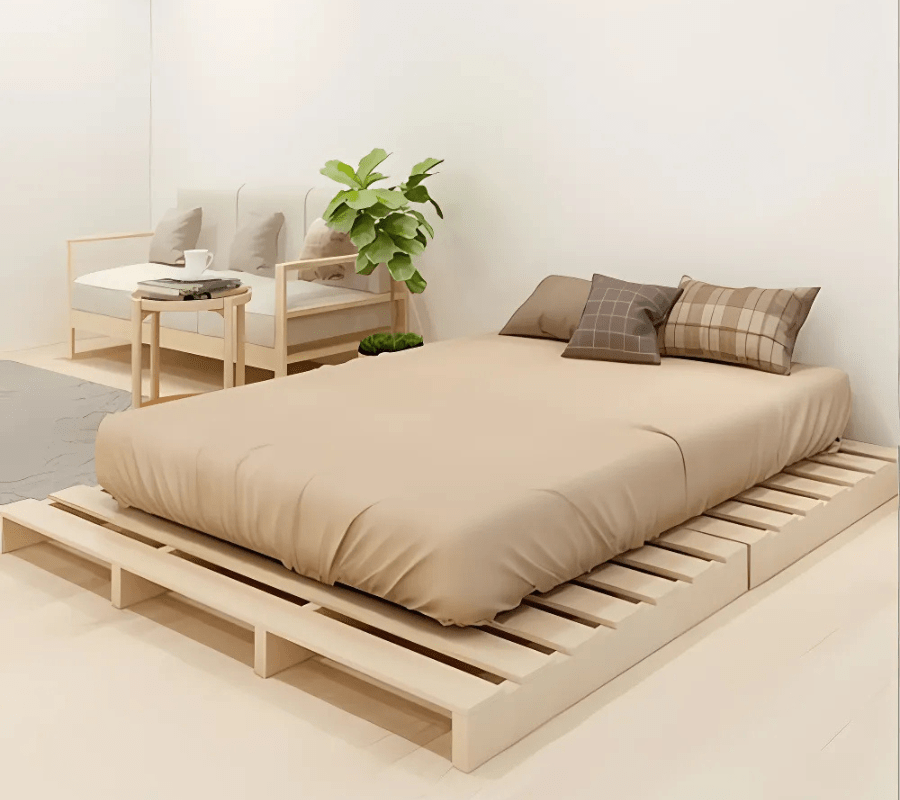 Giường chân thấp Pallet (Phong cách mộc mạc): Sử dụng các thanh gỗ pallet tái chế hoặc gỗ thông mới được xử lý để tạo thành khung giường thấp. Mang đến vẻ đẹp thô mộc, gần gũi, phù hợp với phong cách Industrial, Boho hoặc DIY. Mẫu này thường có giá thành rẻ hơn nhưng cần xử lý gỗ kỹ lưỡng để đảm bảo độ bền và an toàn.