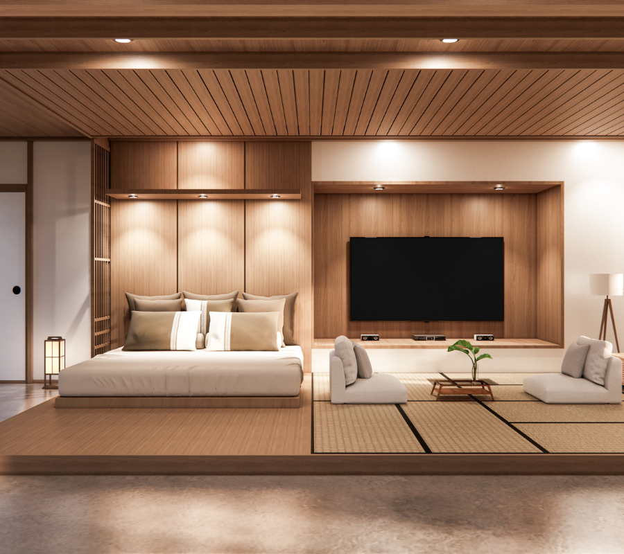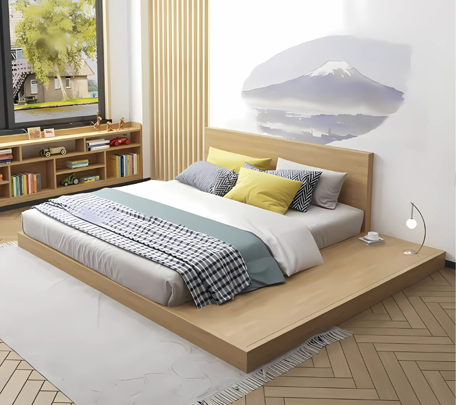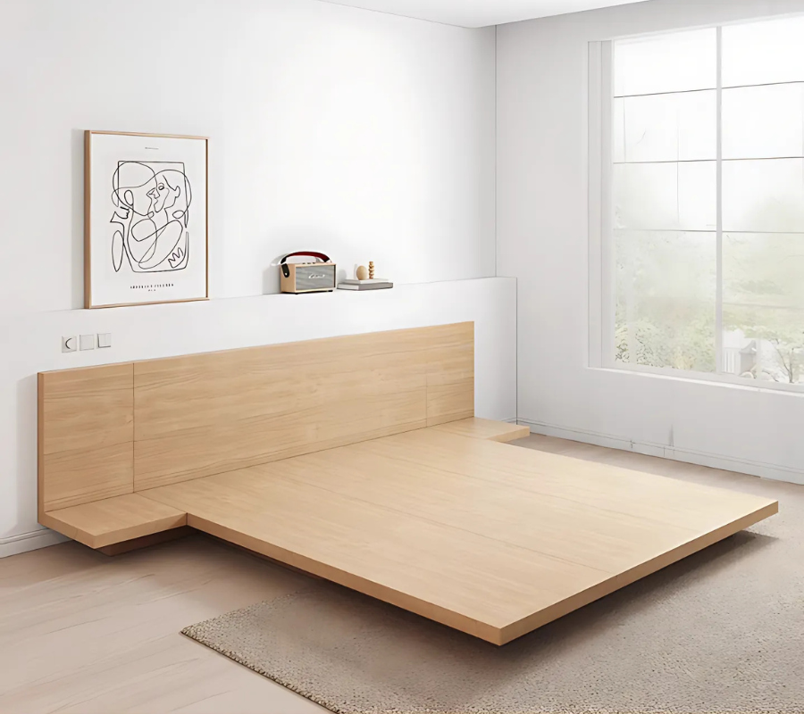 Giường bệt gỗ kiểu Nhật (Japanese Platform Bed): Đặc trưng là chiều cao cực thấp, gần như sát sàn, khung giường thường rộng hơn nệm tạo thành bệ xung quanh. Mẫu này mang đến sự yên bình, thiền định và tối giản tuyệt đối. Thường làm từ gỗ tự nhiên hoặc gỗ công nghiệp vân gỗ sáng màu.