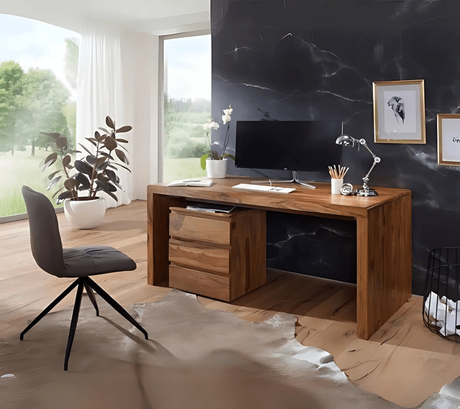 - Bàn làm việc gỗ tự nhiên có hộc tủ: Mang vẻ đẹp sang trọng, ấm cúng và độ bền cao. Thường có thiết kế đơn giản nhưng tinh tế.