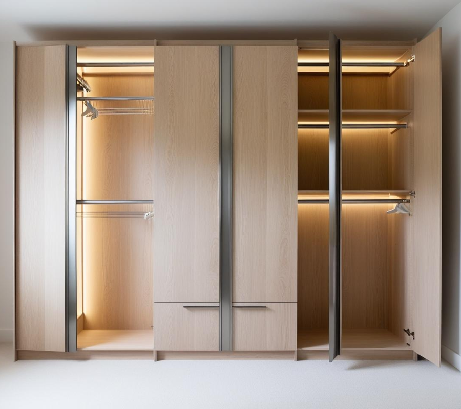 Tủ có tích hợp ánh sáng: Đèn LED được lắp đặt dọc theo thân tủ hoặc bên trong các khoang, không chỉ tăng tính thẩm mỹ mà còn giúp việc tìm kiếm quần áo dễ dàng hơn.