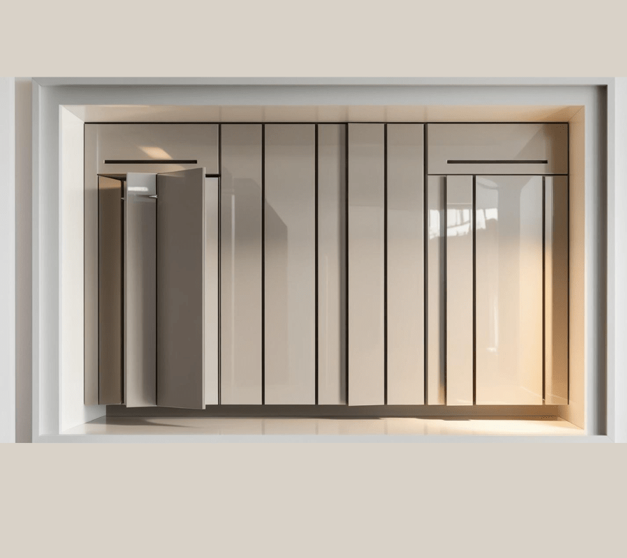 Tủ không tay nắm với hệ thống nhấn mở: Loại tủ này mang đến vẻ đẹp liền mạch và tinh tế tuyệt đối, chỉ cần một thao tác nhấn nhẹ để mở cánh tủ.