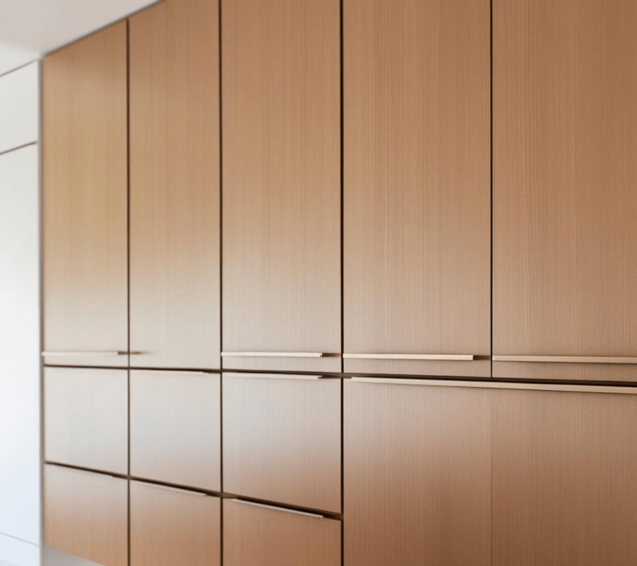 Tủ cánh phẳng màu đơn sắc: Những chiếc tủ với cánh cửa phẳng lì, không tay nắm hoặc tay nắm âm, mang gam màu trắng, xám, be, hoặc các màu pastel nhẹ nhàng sẽ là lựa chọn hàng đầu cho phong cách tối giản.