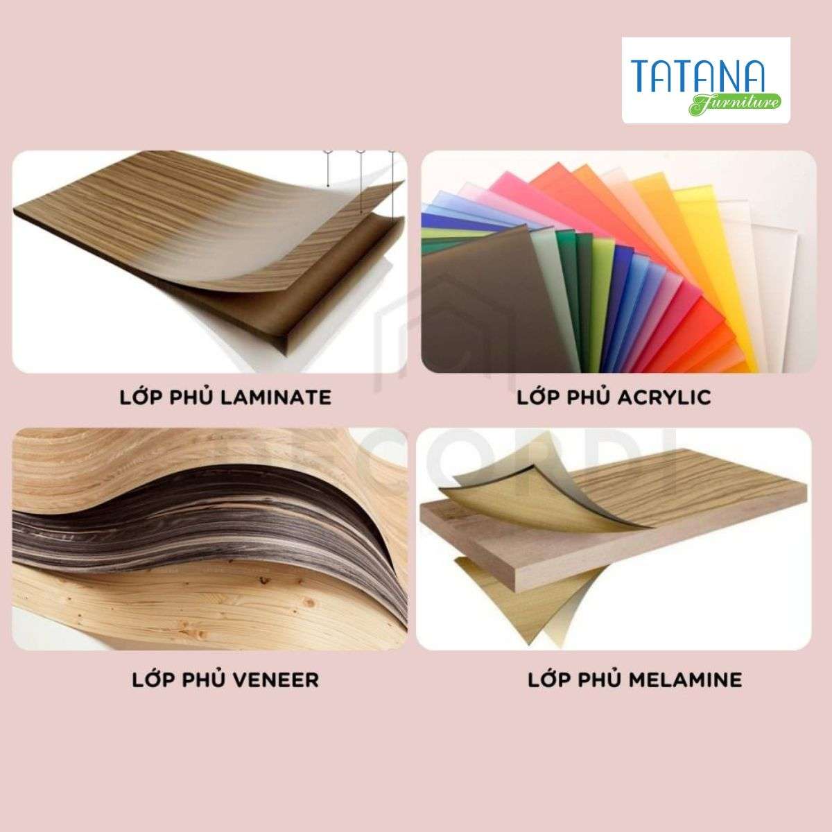 - Lớp phủ bề mặt: Các lớp như Melamine, Laminate, Acrylic… giúp bảo vệ cốt gỗ khỏi tác động môi trường và tạo nên vẻ đẹp màu sắc, vân gỗ tinh tế.